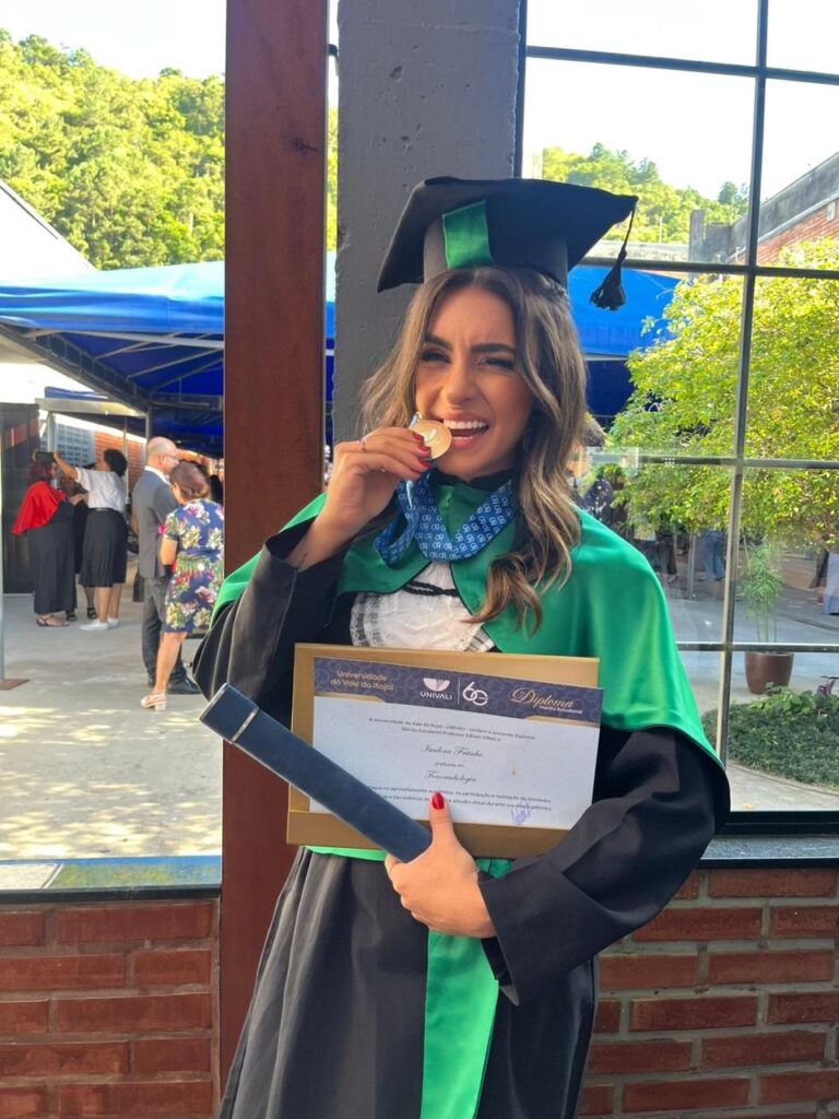 Anos depois, a vida me levou para o litoral. Morei em Balneário Camboriú e estudei em Itajaí, onde me formei em Fonoaudiologia pela UNIVALI. Foram cinco anos intensos — de estudo profundo, envolvimento acadêmico e amadurecimento profissional.